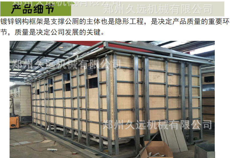 1、房體結構: 采用輕鋼龍骨結構,鋼材全部使用國家標準鍍鋅鋼材。根據(jù)房體的大小特選用國標方管(50-100)焊接而成。鍍鋅管厚度為2.8mm,方管經(jīng)過除銹后進行鍍鋅、防腐處理。這樣就會延長廁所使用壽命。